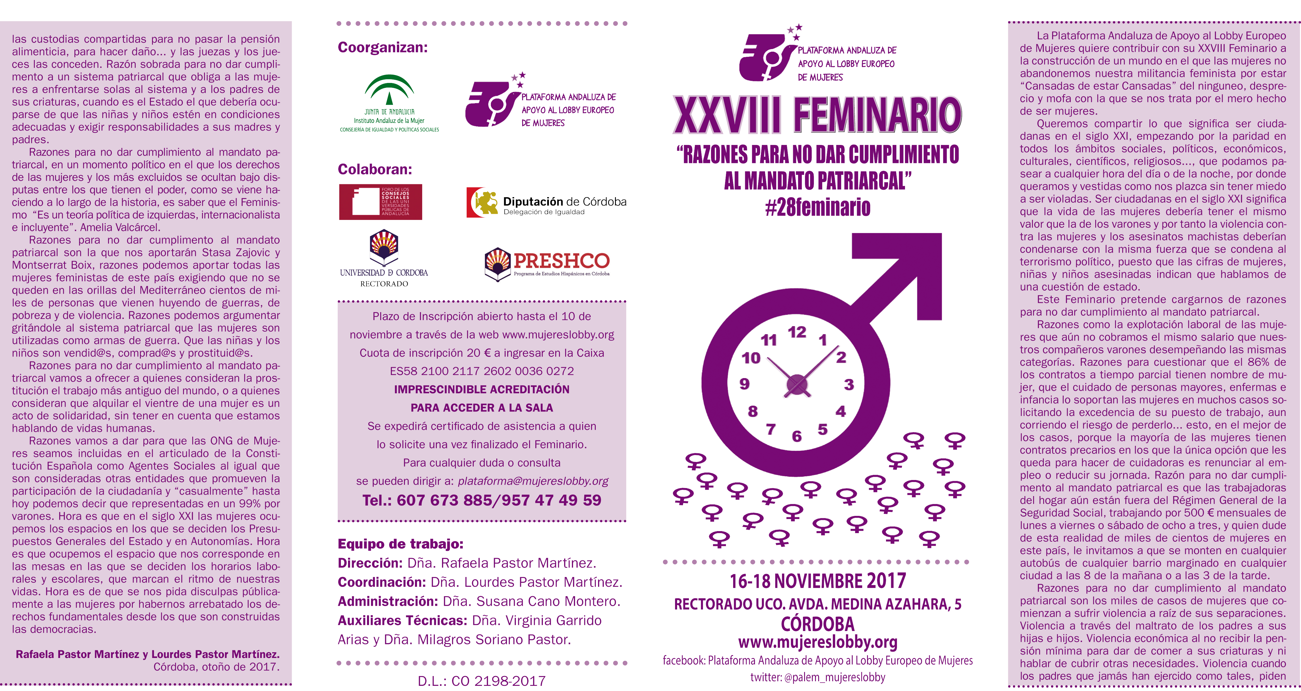 La Plataforma Andaluza de Apoyo al Lobby Europeo de Mujeres celebra la vigésimo octava edición de su feminario, que tendrá lugar del 16 al 18 de noviembre de 2017 en el Salón de Actos del Rectorado de la Universidad de Córdoba.